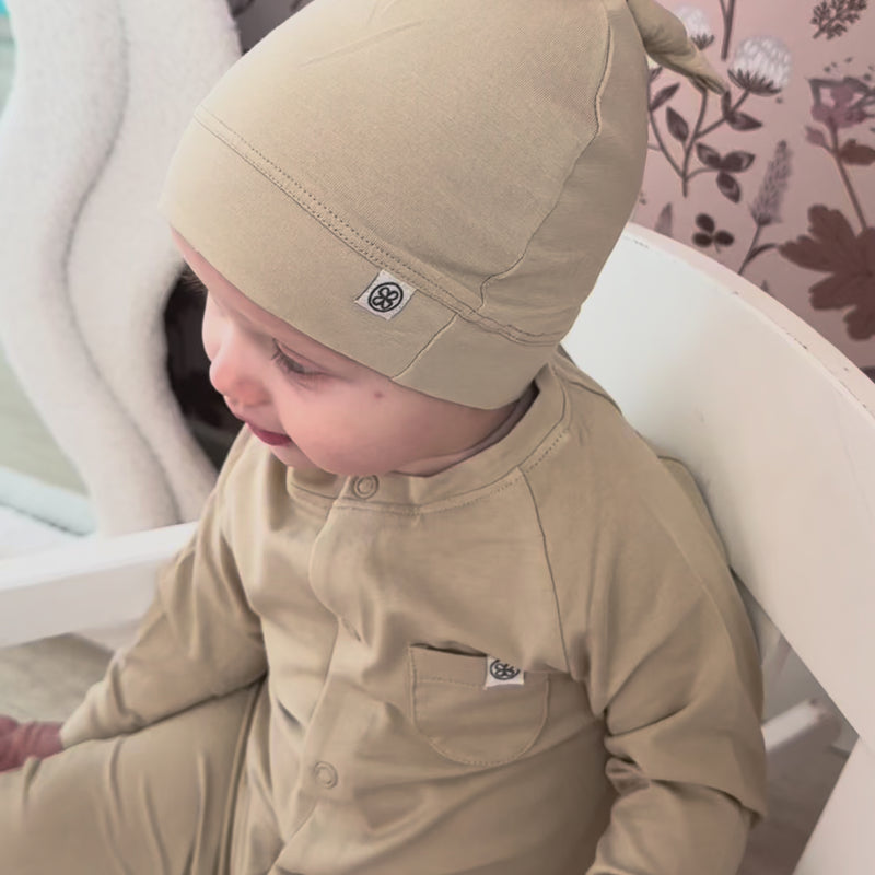 Le bonnet à nœud est un indispensable du quotidien, à l’intérieur comme à l’extérieur, et s’accorde parfaitement avec nos combinaisons bébé.